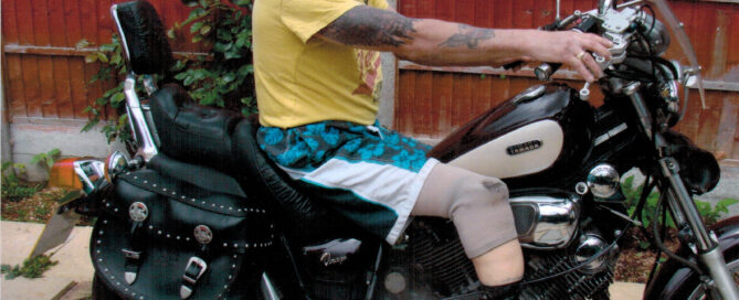 Key stability, control, and safety considerations for riders with above-knee amputations, including adaptations, prosthetics, and alternative motorcycle configurations.
