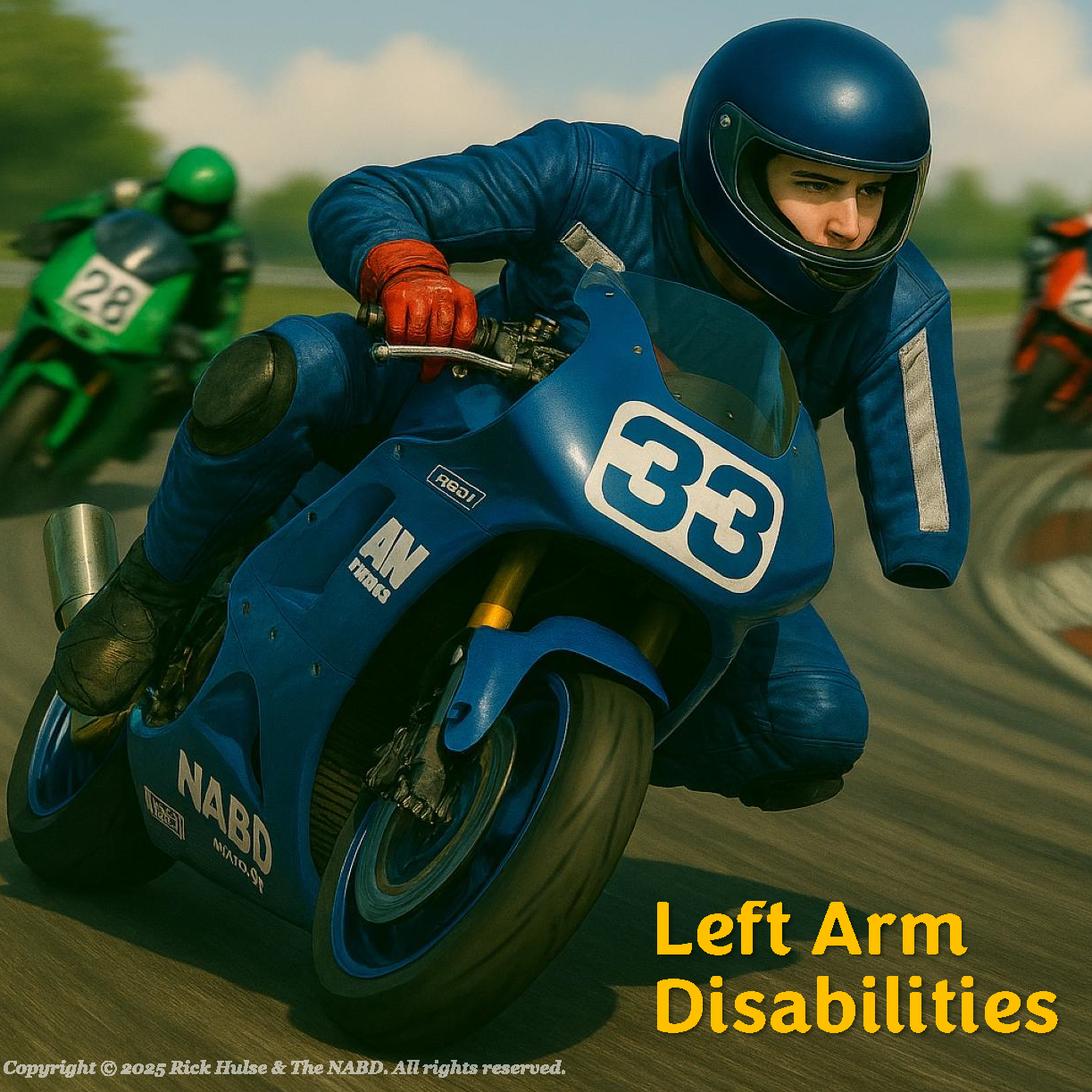 There are many types of disabilities that can impair the use of a left arm or hand and affect the ability to operate motorcycle controls. These include: