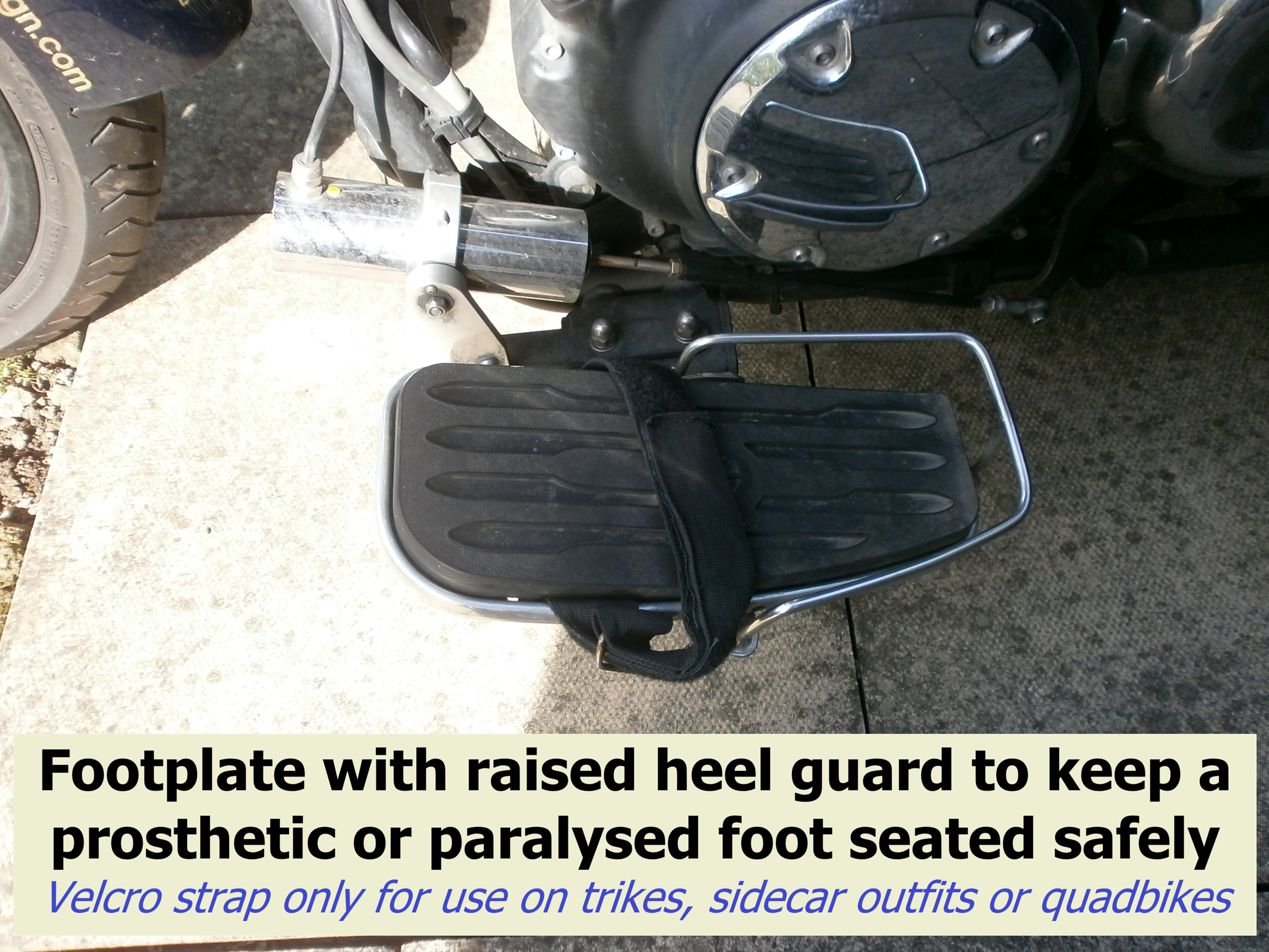 Where a right leg disability involves a below knee amputation or any other condition that can interfere with the sensory feedback from, or special awareness of, the left foot, we strongly recommend the standard footpeg is replaced with a footplate that supports a greater proportion of the foot, to avoid the risk of it slipping off a standard footpeg and contacting the road surface and/or moving parts of the motorcycle, with potentially disastrous results.